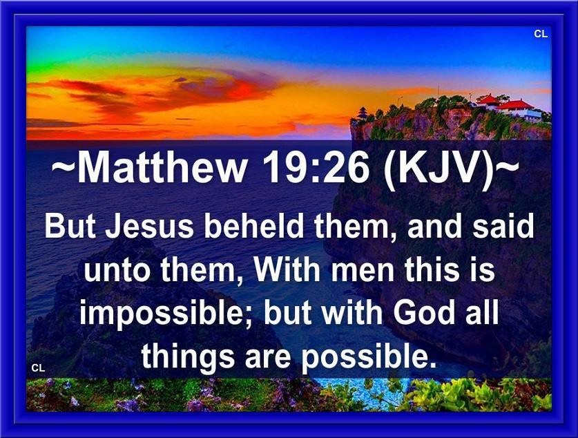 Good Day Everyone!! I would like to ask everyone a very important question. What does this Bible verse Matthew 19:26 mean to all of you? For me personally, I have to change my expectations and allow God to work things out for me. Matthew 19:26 in the King James Version states 26.) But Jesus beheld them and said unto them, with men this is impossible; but with God all things are possible.