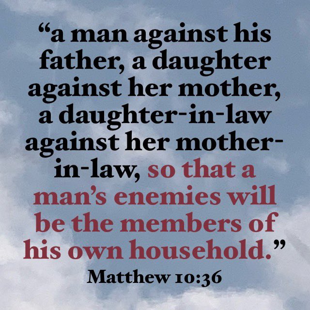 This is tragic but true. It is purely the grace of God when all one’s household repents and loves Jesus, such as was the case with the Philippian jailer. Nevertheless, many are called, but few are chosen (Mt 22:14), so it should come as no surprise when some in our own household oppose us in our faith.