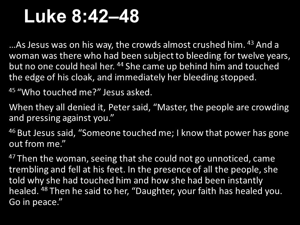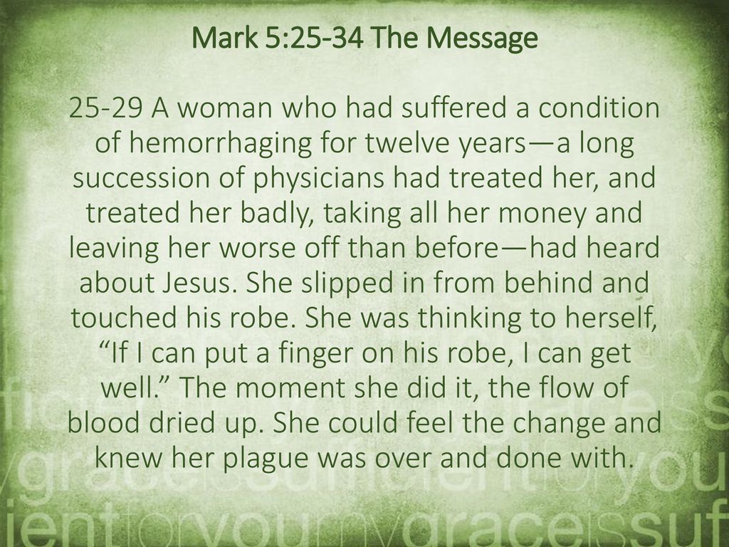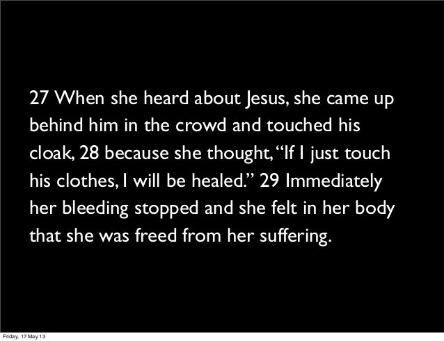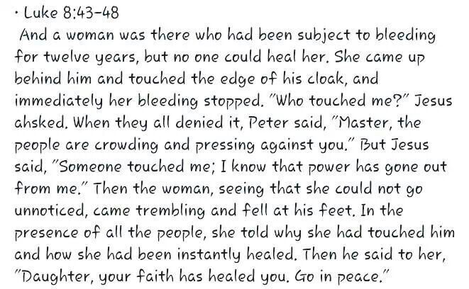 Mark 5:25-34 says that now a certain woman had a flow of blood for 12 years, and suffered many things from many physicians. She had spent all that she had and was no better, but rather grew worse. When she heard about Jesus, she came behind Him in the crows and touched His garment. For she said “If only I touch His garment His clothes, I shall be made well.”