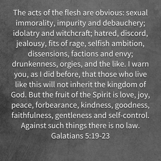 The acts of the flesh are obvious: sexual immorality, impurity and debauchery; idolatry and witchcraft; hatred, discord, jealousy, fits of rage, selfish ambition, dissensions, factions and envy; drunkenness, orgies, and the like. I warn you, as I did before, that those who live like this will not inherit the kingdom of God.