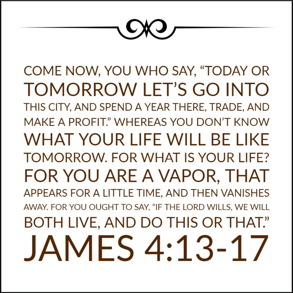 Boasting about tomorrow is a sin in itself because it is not promised to any of us. I want you to know that we cannot pre plan anything anyway. This is simply because it is not promised to us. Instead of saying we shall do this or that tomorrow: We will go and do such and such a thing. For your life itself is a vapor that appears for a little while. For what is your life anyway. Man is like a breath, and his days are a passing shadow; Psalms 144:4.