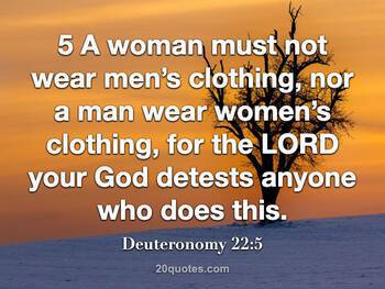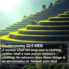 This is an essay that is pertaining to one Bible verse. The Bible verse is Deuteronomy 22:5: Says A Woman shall not wear anything that pertains to a man, nor shall a Man put on Women’s garment, for all who do so are an abomination to the Lord your God. I personally understand that it is the 21st Century. It is that men and women are not reading the Bible.