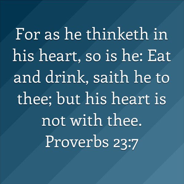 Good Day Everyone!! How are you doing today? Fine, I hope. I would like to start things off by saying that Proverbs 23:7: Says; for as he thinketh in his heart, so is he: Eat and drink, saith he to thee: but his heart is not with thee.