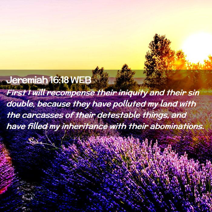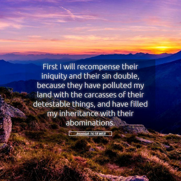 Jeremiah 16:18 WEB Says: First I will recompense their iniquity and their sin double, because they have polluted my land with the carcasses of their detestable things, and have filled my inheritance with their abominations. The definition of the word recompense is to make amends to (someone) for loss or harm suffered; compensate. A compensation or reward given for loss or harm suffered or effort made.