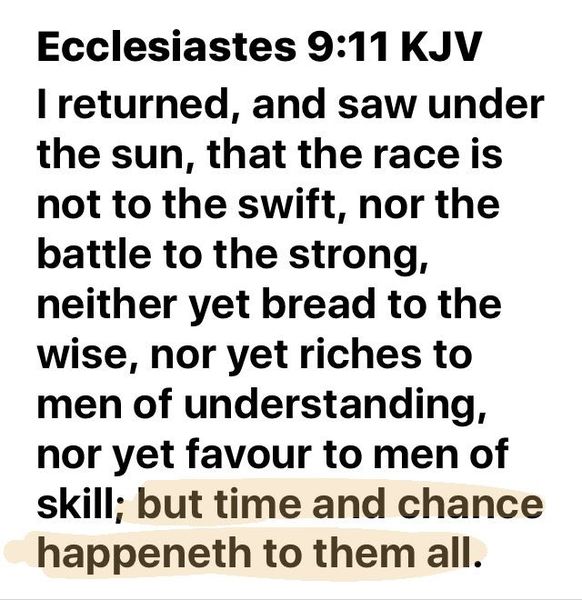 This is an interpretation of Ecclesiastes 9:11. The Bible verse means that we have to persevere and go through personal trials and tribulations for Jesus Christ sake. I say this is simply because it gives me an opportunity to do what I want in Jesus name. What is the definition of the word opportunity? The answer to this question is a chance for advancement and improvement. This also means that I have to maintain my faith in God; in spite of any problems that are in my way as far as obstacles are concerned.