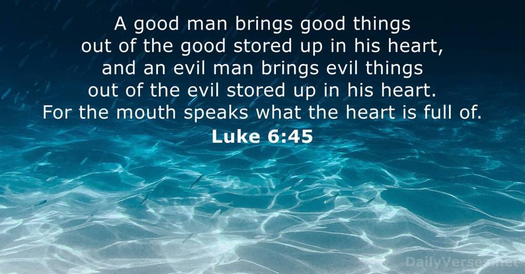 Good Evening Everyone!! How are you doing this evening? Fine, I hope. I am writing an essay about Luke 6:45, and it says: A good man brings good things out of the good stored up in his heart, and an evil man brings evil things out of the evil stored in his heart. For the mouth speaks what the heart is full of.