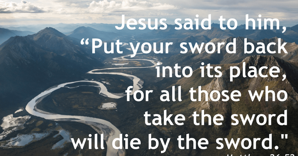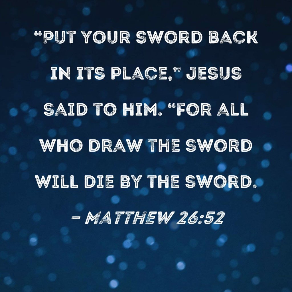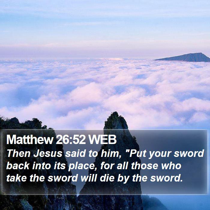 Matthew 26:52 says:. Then Jesus said to him, Put your sword back in it’s place, for all those who take the sword will die by the sword. This is a metaphor for things present and things to come. What it means that if you do harm to another person, the same thing shall happen to you in return. This is called Karma. You shall reap what you sow. It might not happen to you, but someone that you know personally.