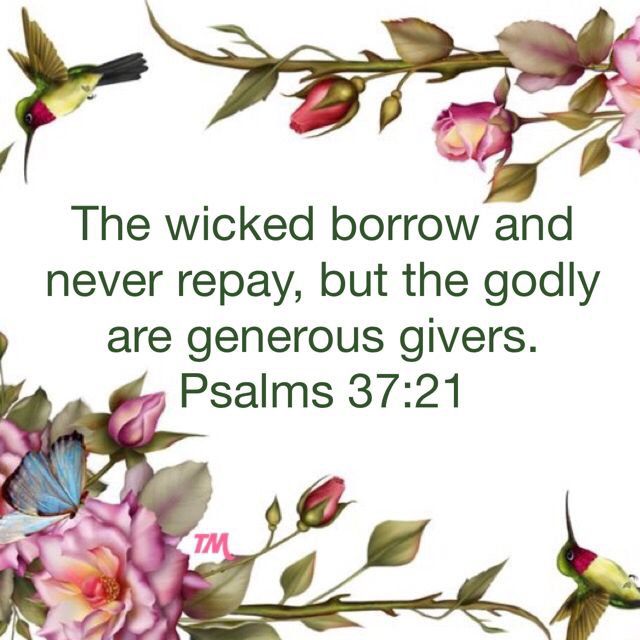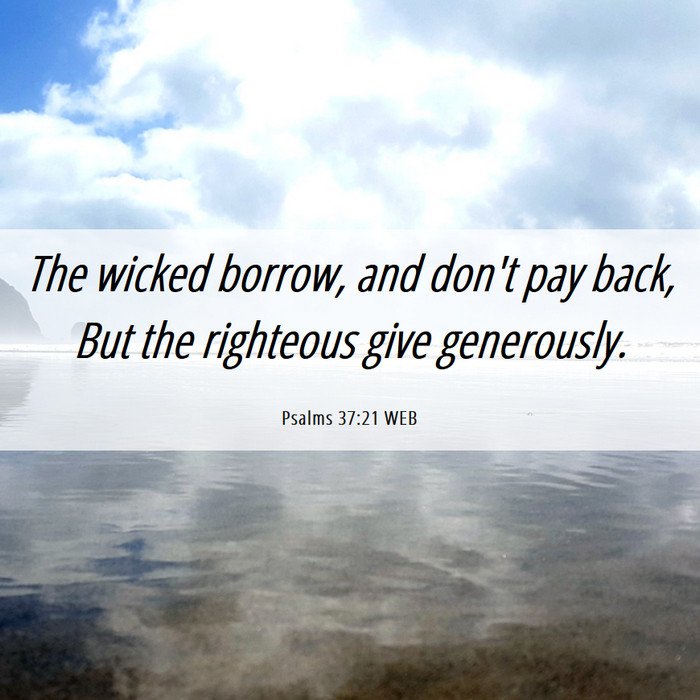 Psalm 37:21 says: The wicked borrow, and don’t pay back . But the righteous give generously. There are generous people who borrow money and still do not pay back money that they borrow from other people. I recall receiving goods and services from other agencies, and it has taken me a long time to pay off my debts. I am considered as a very generous person. I have just ran on very hard times.