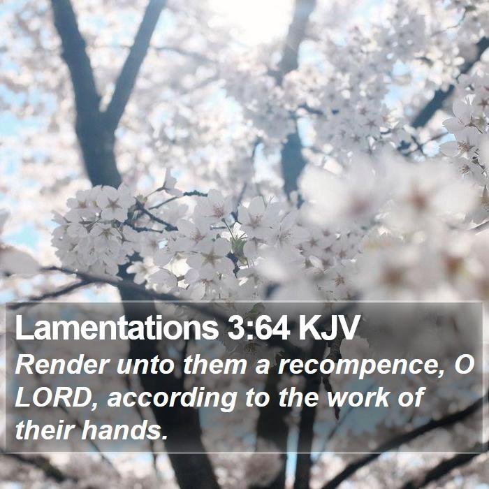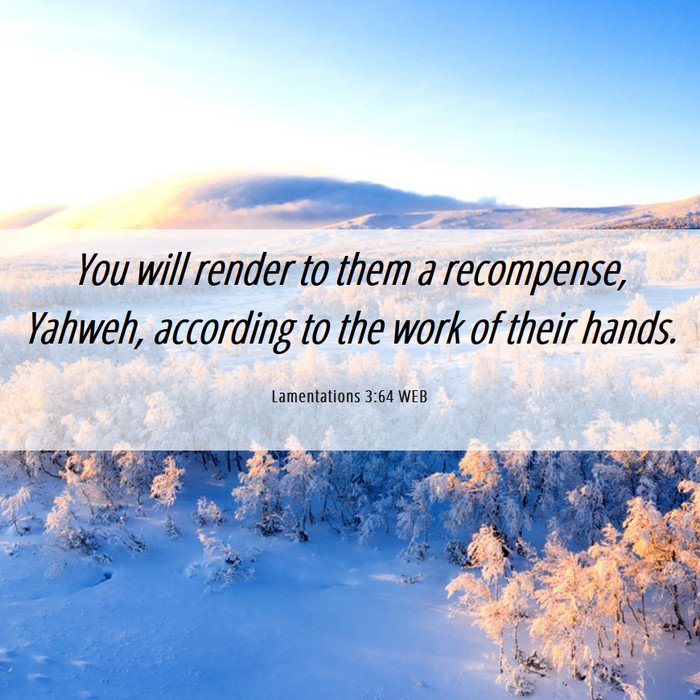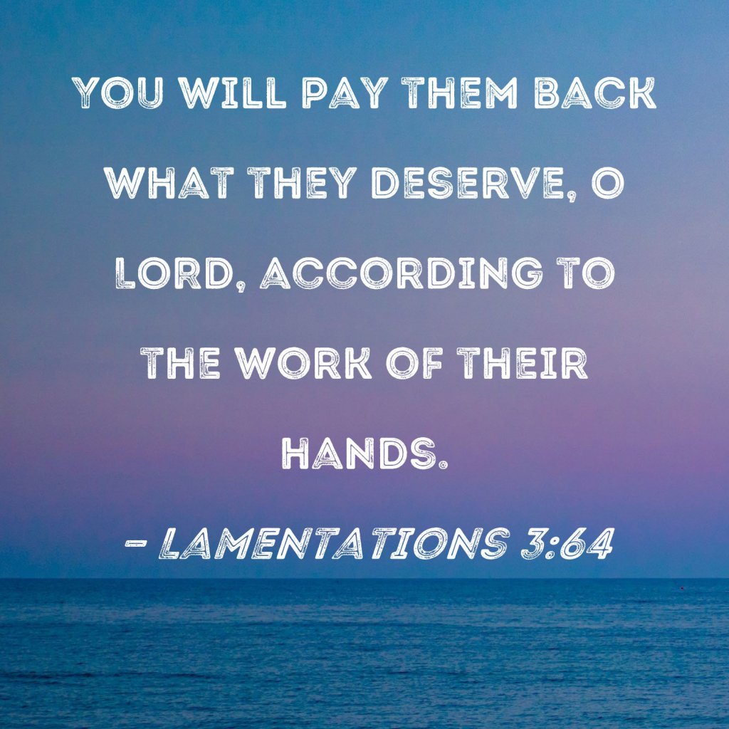 Lamentations 3:64 says: You will pay them back, O Lord, according to the work of their hands. Jeremiah is saying that we should be paid back according to the work of our own hands. This is very serious because this means that if we do wrong inside of the eyes of God, then, we shall receive what was done in the body of the person. I know for me, it is like reaping what we have sown. I am realizing that God is a Righteous Judge. I will admit that I have done wrong all of my life. I am not saying that I am perfect, but I am not.