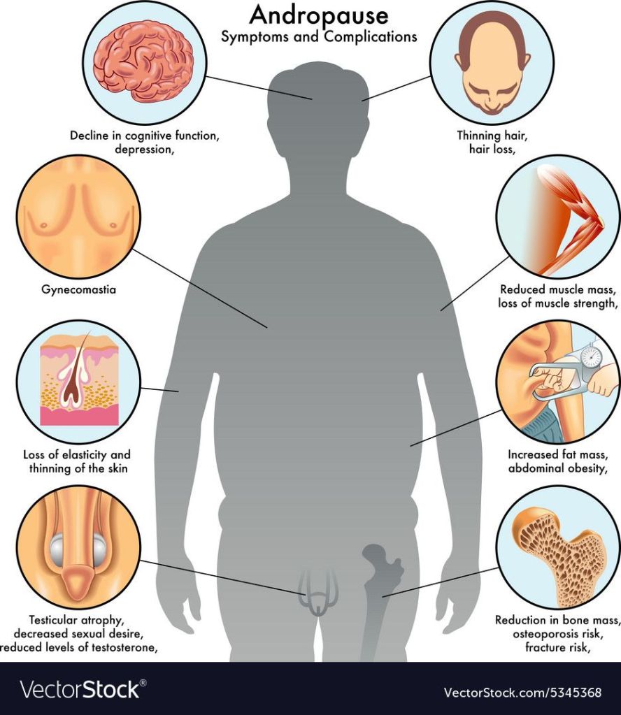 Andropause is the male version of menopause. For Instance, I have been going through these symptoms of Andropause for the past nine years now. The first thing that happens is that Men start losing their testosterone levels. In some cases, a man’s brain and testicles tend to shrink in size. For me personally, my testosterone levels have dropped 74 points in one year. Last year, my testosterone levels were 303 which is very low as well. This year, my testosterone levels dropped to a 229 level. If I continue to lose 74 points per year, I would have a testosterone levels of 155.