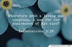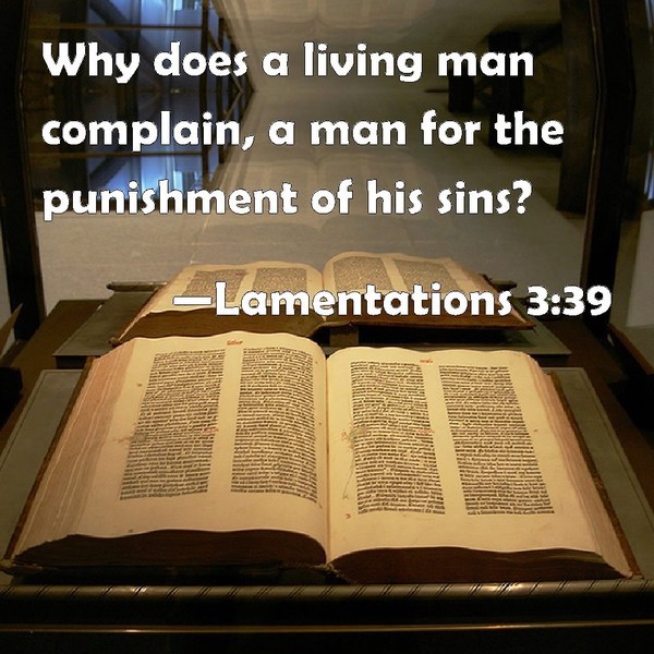 39. Why Should a living man complain, a man for the punishment of his sins? Allow me to expand on this Bible verse. Lamentations 3:39 has a whole lot to do with the sins that we commit against God. When it comes to a man, woman, and child that sins, why shall we complain when we sin against God?